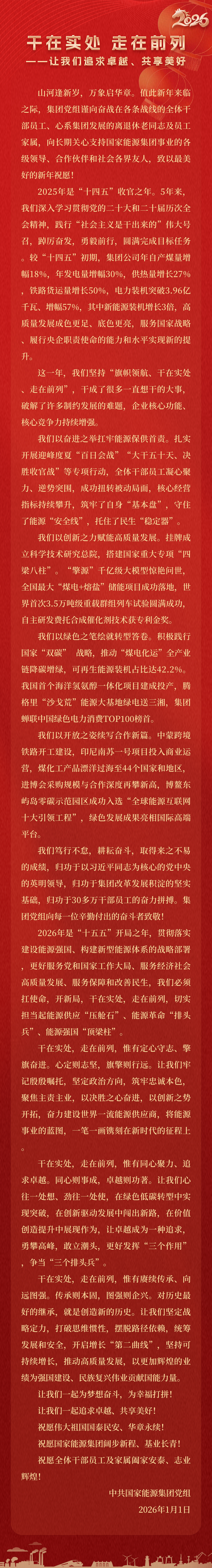 國家能源集團胸懷“國之大者”,增產增供、穩價穩市,積極服從服務國家戰略、保障國家能源安全、助力國民經濟穩增長,推動煤炭安全綠色智能、煤電清潔高效穩定、現代煤化工高端多元低碳、運輸物流協同一體、新能源多元創新規模化發展,全力擔當能源強國頂梁柱,能源供應壓艙石,能源革命排頭兵。